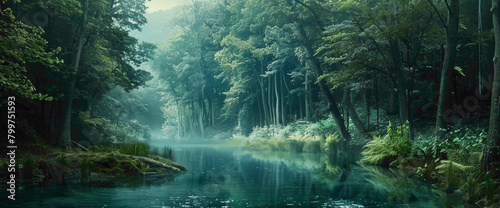 © kashif, Obraz premium A serene teal-colored river winding its way through a quiet forest, its gentle flow inviting peaceful contemplation.
