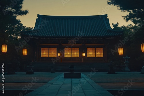 Fototapeta premium A serene temple illuminated at dusk, showcasing tranquility and cultural...