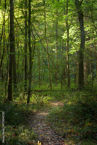 Fototapeta premium A serene trail winds through a dense forest filled with vibrant green trees...