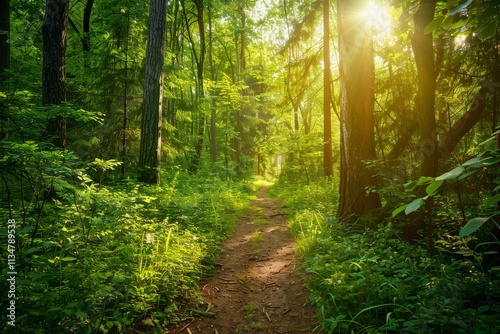© Tanu, Obraz premium A serene trail winds through a lush forest, bathed in warm sunlight filtering through the tree canopy, inviting nature lovers to explore.