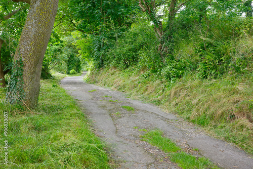 Fototapeta premium A serene, tree-lined country road surrounded by lush greenery, perfect for a...