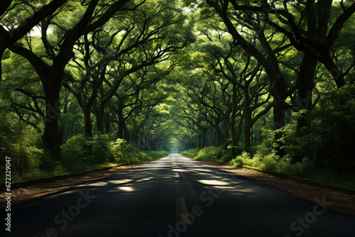 © youriy, Fototapeta premium A serene tree-lined road leading into the forest