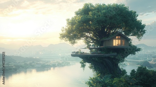 © isend, Fototapeta premium A serene treehouse perched high above a misty river valley.