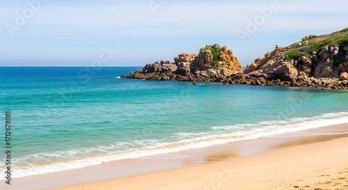 Fototapeta premium A serene tropical beach paradise with turquoise water, palm trees, and white...