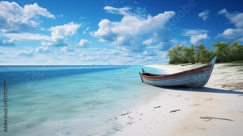 © Miva, Naklejka premium A serene tropical beach scene with a lone boat resting on the shore