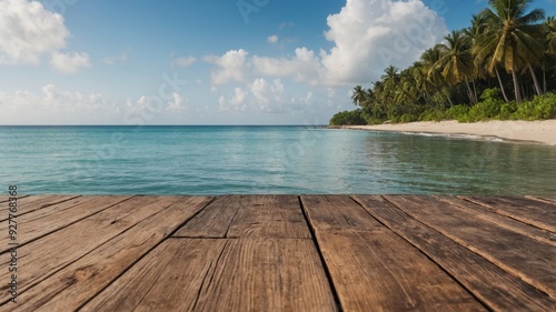 Fototapeta premium A serene tropical beach scene with a wooden deck overlooking the ocean perfect for a copy space image.