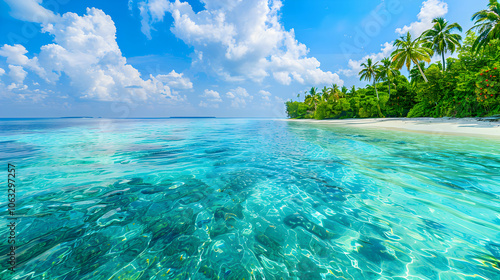 © Taufiq, Fototapeta premium A serene tropical beach scene with clear turquoise water and lush greenery.