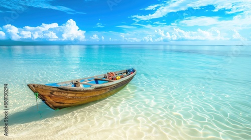 © Tisit, Naklejka premium A serene tropical beach with a lone wooden boat resting on the shallow, crystal-clear water.
