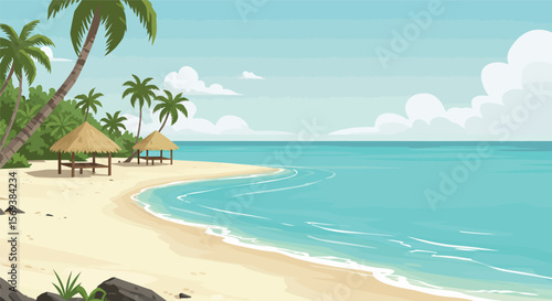 © grvect02, Fototapeta premium A serene tropical beach with swaying palm trees, crystal-clear ocean water, and a bright blue sky invites a relaxing summer vacation in paradise