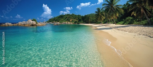 Fototapeta premium A serene tropical beach with white sand, turquoise water, and lush palm trees.