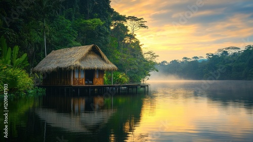 Fototapeta premium A serene tropical hut on a lake at sunset with beautiful water reflections and forest