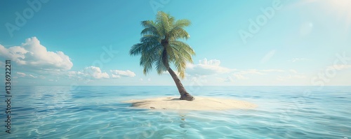 Fototapeta premium A serene tropical island featuring a lone palm tree surrounded by crystal...
