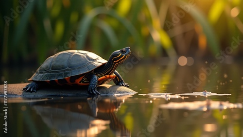 © Ernesto, Obraz premium A serene turtle basking under the sun on a rock, enjoying the warmth. This peaceful, reflective moment captures the essence of turtles, perfect for celebrating National Pet Day with a calm, natural to