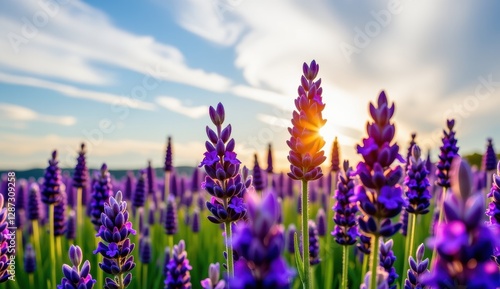 © cookiecutter, Naklejka premium A serene twilight landscape unfolds, featuring a field of blooming lavender, its delicate purple flowers reaching towards a soft, pastel-colored sky.