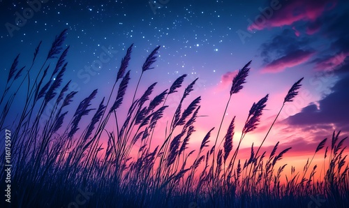© EFA, Fototapeta premium A serene twilight scene with silhouetted grass against a starry sky.