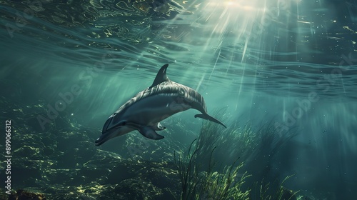 © Thanthara, Obraz premium A serene underwater scene featuring a dolphin gracefully swimming with sunlight piercing through the water.