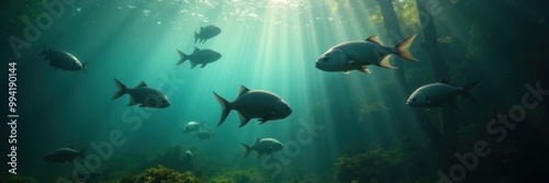 Fototapeta premium A serene underwater scene featuring a school of fish illuminated by rays of...