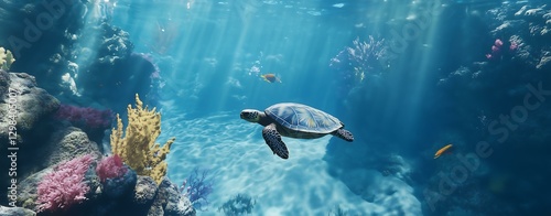 © Prapanista, Fototapeta premium A serene underwater scene featuring a turtle swimming past colorful coral reefs.