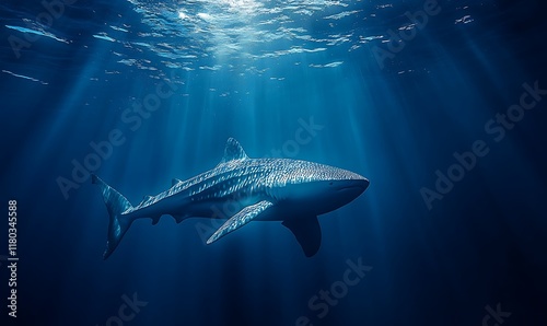 Fototapeta premium A serene underwater scene featuring a whale shark swimming gracefully.