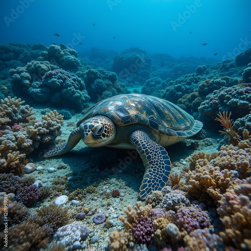 Naklejka premium A Serene Underwater Scene with a Sea Turtle and Vibrant Coral Reefs