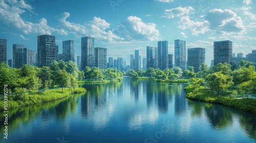 Fototapeta premium A serene urban landscape with modern buildings and lush greenery by a...
