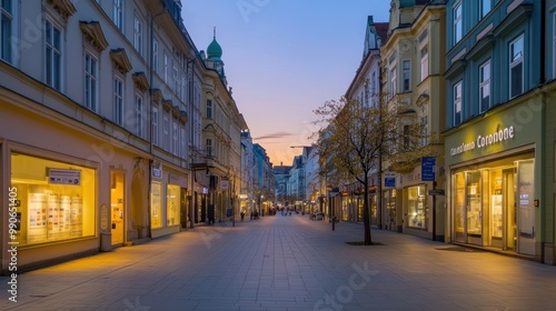 Fototapeta premium A serene urban street at dusk, showcasing shops and a calm atmosphere.