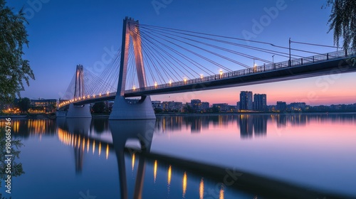 Fototapeta premium A serene view of a cable-stayed bridge illuminated at dusk, reflecting in...