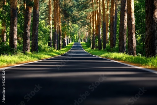 Naklejka premium A serene view of a winding road surrounded by tall trees, inviting...