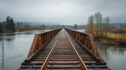 Naklejka premium A serene view of an old wooden bridge stretching over a calm river,...