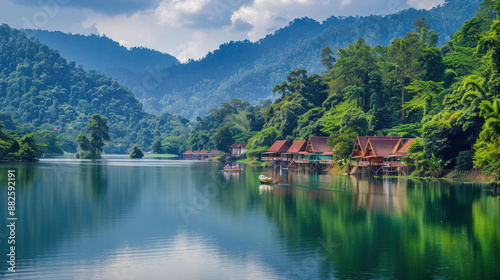 © Chatchanan, Fototapeta premium A serene view of Ban Rak Thai village nestled beside a tranquil lake, surrounded by lush green mountains