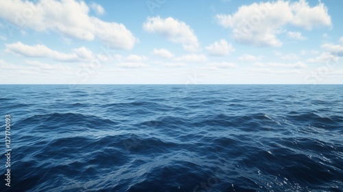© kept, Fototapeta premium A serene view of calm ocean waves with fluffy clouds in a clear blue sky.