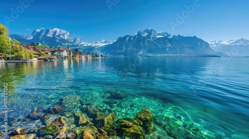 © Nosheen, Fototapeta premium A serene view of Lake Lucerne with crystal-clear waters, surrounded by majestic mountains and quaint villages