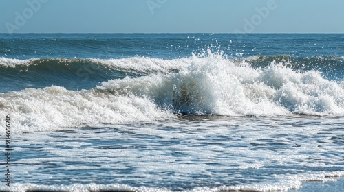 Fototapeta premium A serene view of ocean waves crashing on a shore under clear blue skies.