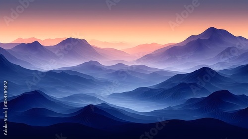 © AIGC JOE, Obraz premium A serene view of rolling blue mountains at dusk, cascading into softer shades of purple and orange, creating a tranquil and dreamy atmosphere.