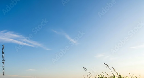 Fototapeta premium A serene view of tall grass against a clear blue sky with wispy clouds in the...