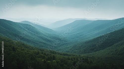 Fototapeta premium A serene view of the Appalachian Mountains with rolling hills and dense forests. No people, copy space.