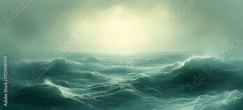 Fototapeta premium A serene view of turbulent ocean waves under a misty, ethereal sky, evoking a sense of calmness and introspection in a muted greenish-blue color palette.