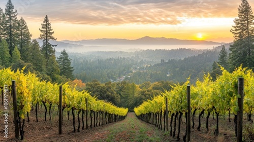 Fototapeta premium A serene vineyard landscape at sunset, showcasing rows of grapevines and...