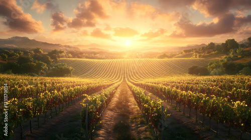 Naklejka premium A serene vineyard landscape at sunset, showcasing rows of grapevines and hills.