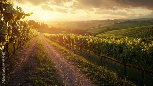 Naklejka premium A serene vineyard landscape at sunset, showcasing rows of grapevines and...