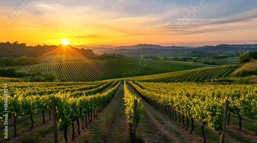 Fototapeta premium A serene vineyard landscape at sunset with lush green grapevines and rolling...