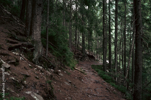 Obraz premium A Serene Walk Through a Dense Pine Forest