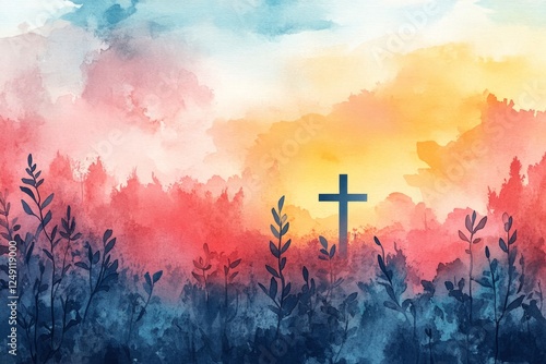 © muhamad, Obraz premium A Serene Watercolor Landscape Featuring A Cross Amid Colorful, Soft Clouds, Evoking A Sense Of Peace And Spirituality.