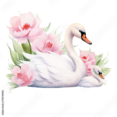 © Janie, Fototapeta premium A serene watercolor painting capturing two elegant swans amidst blooming pink flowers, reflecting grace and tranquility.