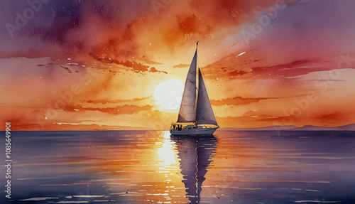 Fototapeta premium A serene watercolor painting of a boat sailing on a calm sea during vibrant sunset. The sky is filled with warm hues of orange, pink, and purple, reflecting off the water, casting a golden glow.
