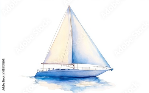 Fototapeta premium A serene watercolor painting of a sailboat with white sails gliding over calm blue waters, evoking a sense of tranquility and freedom.