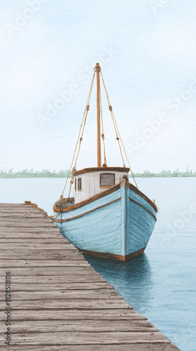 Fototapeta premium A Serene Watercolor Scene of a Blue Boat at the Pier Reflecting on Calm Waters, Evoking Tranquility and the Charm of Nature in Travel Adventures