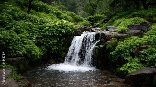Naklejka premium A serene waterfall cascades amidst lush green foliage evoking a sense of...