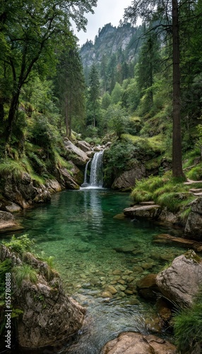 © Piksel, Fototapeta premium A serene waterfall cascades into a clear, turquoise pool, framed by trees