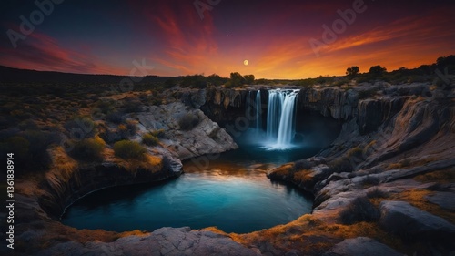 Fototapeta premium A serene waterfall cascades into a tranquil pool, illuminated by a colorful...